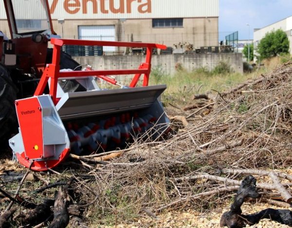 TRITURADOR FLORESTAL DE MARTELOS FIXOS COM PONTA DE VIDEA PARA TRONCOS DE ATÉ Ø25CM. Triturador florestal adequado para arbustos e troncos de até 200 mm de diâmetro, assim como para a trituração de madeira, jardinaria e agrícola. Equipamento: estrutura compacta e robusta feita de chapa de alto limite de resistência. Proteções suficientes para garantir a segurança do operador. Fácil manutenção. Roda libre incluída no grupo multiplicador. Correias de transmissão SPBX dentadas. Porta traseira hidráulica. Martelos fixos de vídea. Patins de aço resistentes com uma regulagem de profundidade. Terceiro ponto da categoria II. Transmissão (opcional). Barra de abaixamento (opcional). Patins para trabalho de profundidade (opcional). Grupo reversível para o acoplamento frontal do trator (opcional). Roletes traseiros de controle (opcional).